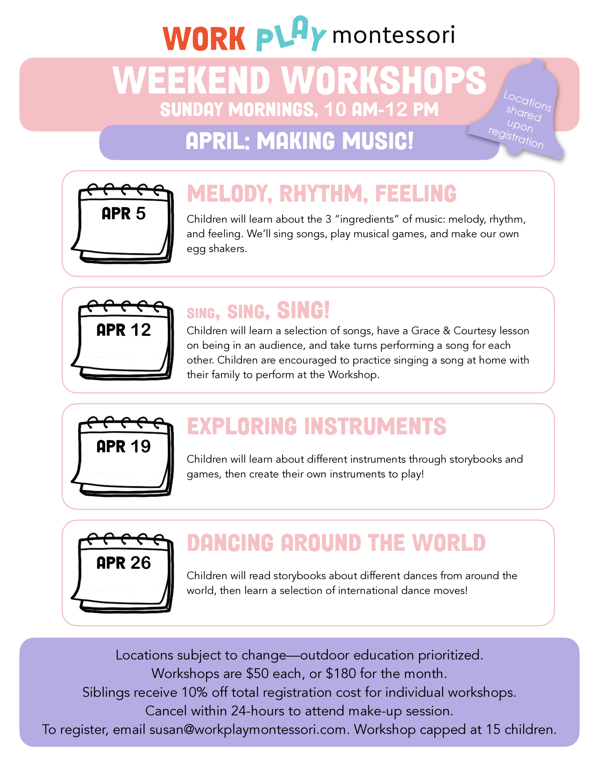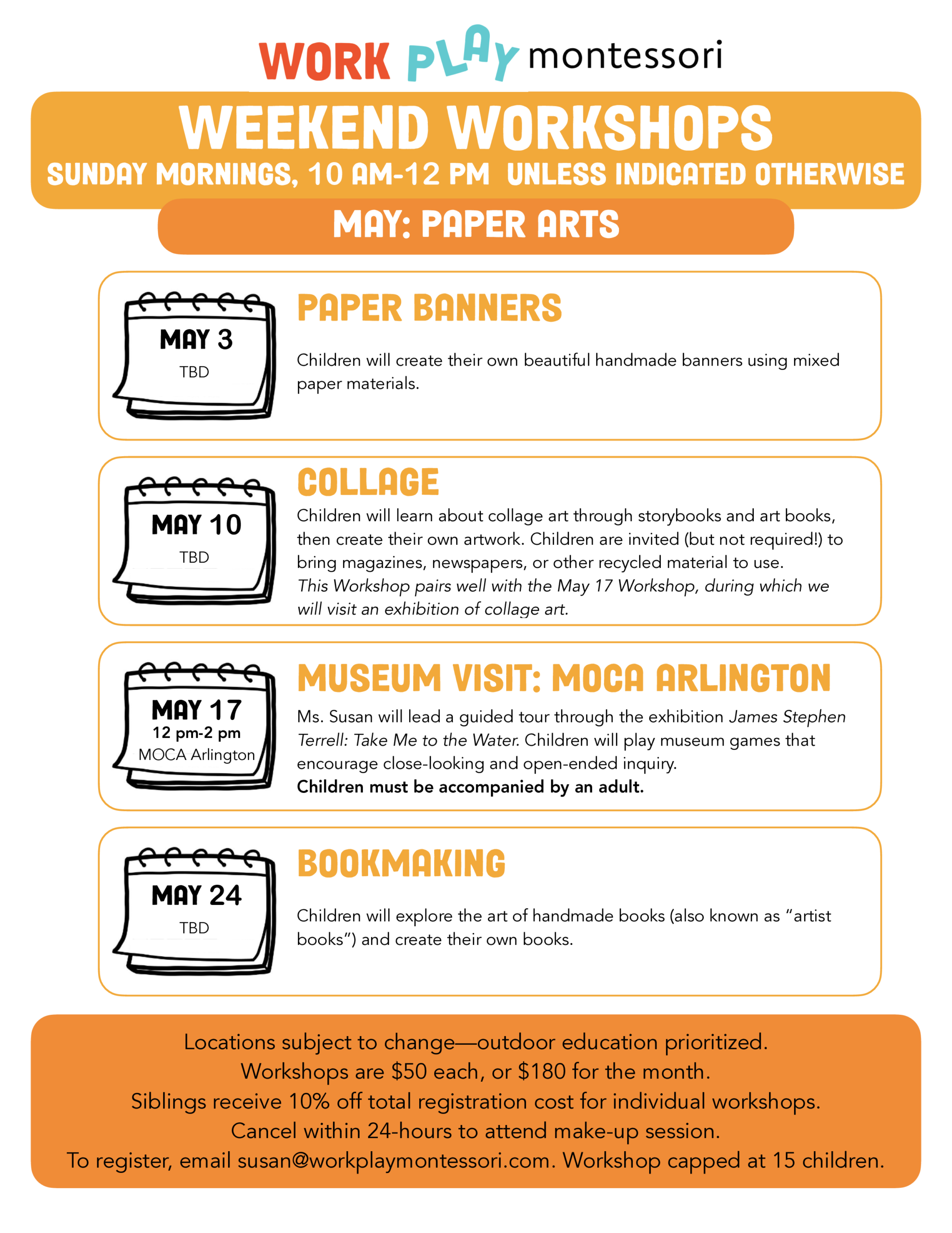 To register your child for Weekend Workshops, email susan@workplaymontessori.com